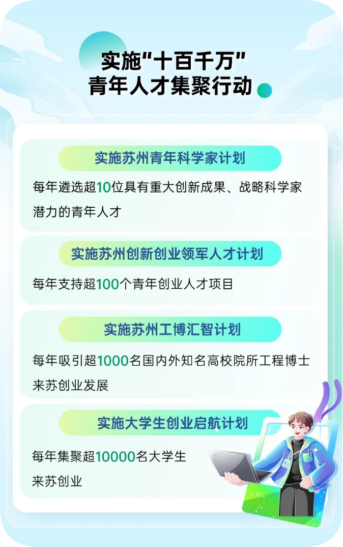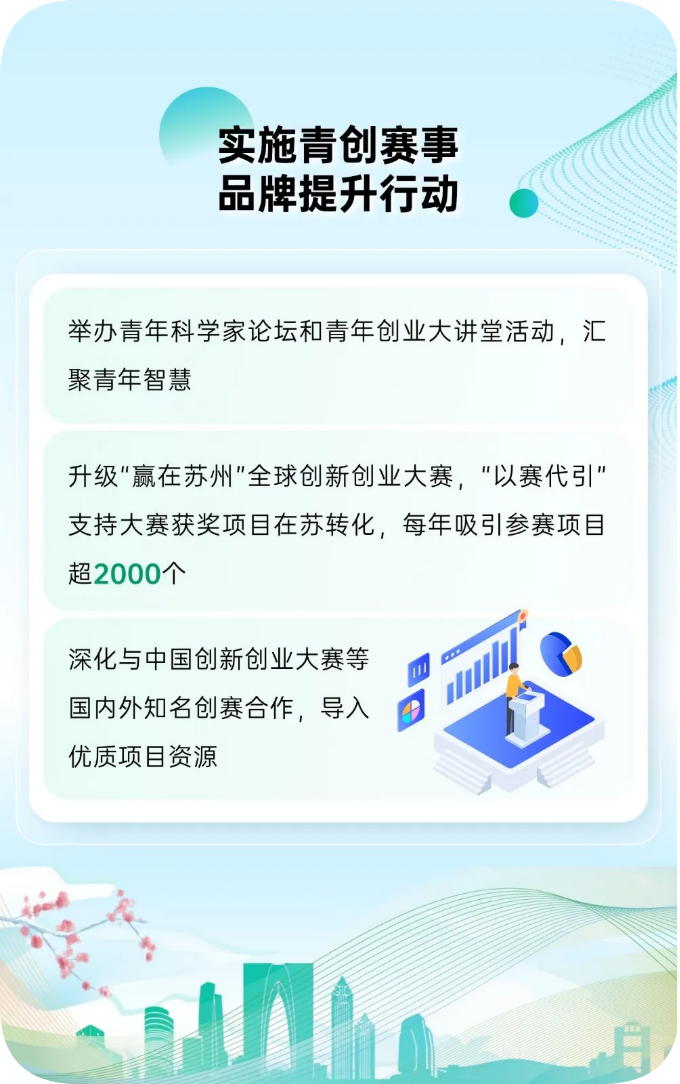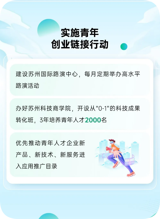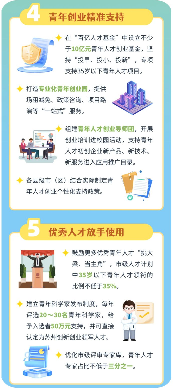 (3)優(yōu)先推薦申報(bào)蘇州創(chuàng)新創(chuàng)業(yè)領(lǐng)軍人才計(jì)劃、“江蘇省高層次創(chuàng)新創(chuàng)業(yè)人才引進(jìn)計(jì)劃”、江蘇“青年雙創(chuàng)英才”以及“創(chuàng)青春”系列大賽。