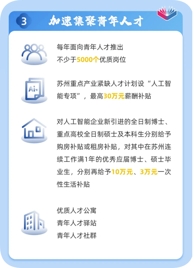 在蘇州市重點(diǎn)產(chǎn)業(yè)緊缺人才計(jì)劃中,每年專設(shè)300個(gè)左右“人工智能專項(xiàng)”名額,經(jīng)認(rèn)定后,給予最高30萬元薪酬補(bǔ)貼。