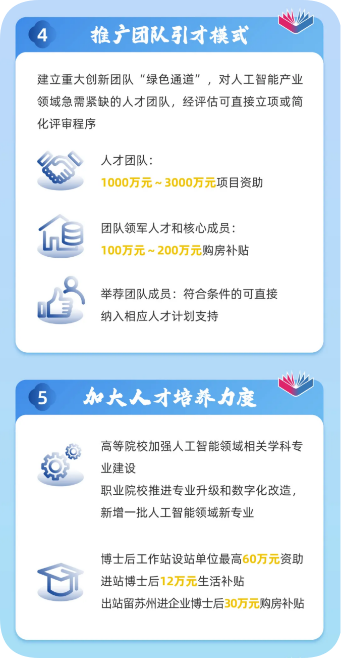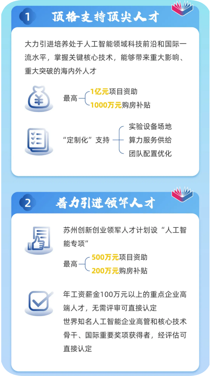 頂格支持人工智能領(lǐng)域頂尖人才,給予3000萬元~1億元項(xiàng)目資助和300萬元~1000萬元購(gòu)房補(bǔ)貼。