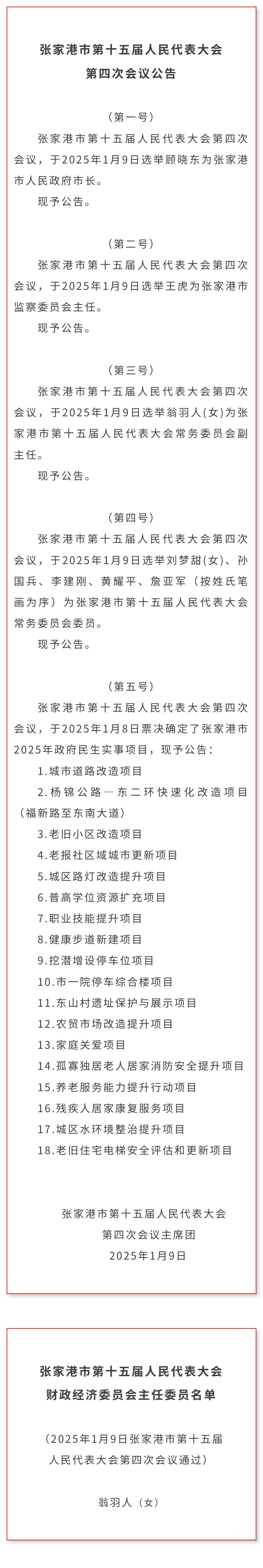 會(huì)議以無(wú)記名投票方式,選舉顧曉東為張家港市人民政府市長(zhǎng),選舉王虎為張家港市監(jiān)察委員會(huì)主任,選舉翁羽人為張家港市第十五屆人民代表大會(huì)常務(wù)委員會(huì)副主任,選舉李建剛、黃耀平、詹亞軍、劉夢(mèng)甜、孫國(guó)兵為張家港市第十五屆人民代表大會(huì)常務(wù)委員會(huì)委員。會(huì)議表決通過(guò)翁羽人為張家港市第十五屆人民代表大會(huì)財(cái)政經(jīng)濟(jì)委員會(huì)主任委員。