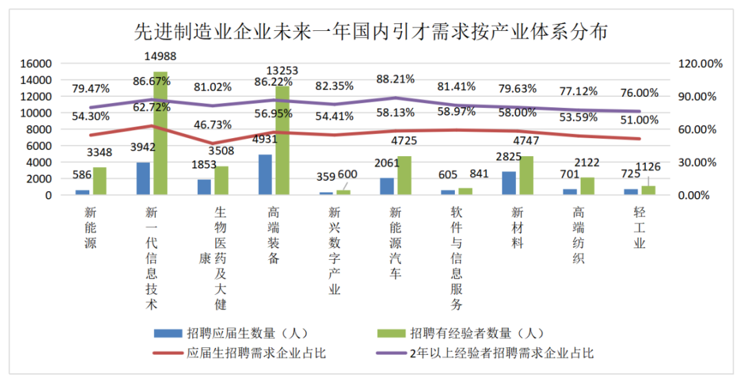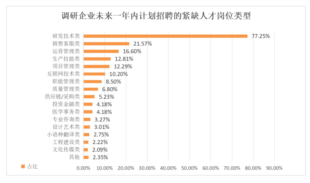 企業在招聘人才中傾向于有工作經驗的人才。82%的參調企業傾向招聘有兩年以上工作經驗的員工。從先進制造業中有兩年以上工作經驗人才需求的企業數量占比看,新能源汽車、新一代信息技術、高端裝備排名前三,占比86%以上。服務業中法律服務行業企業對有兩年以上工作經驗人才的需求占比達到了100%,其次為康養服務、檢驗檢測認證服務。同時有77.25%的企業未來一年內計劃招聘研發技術類緊缺人才崗位;21.57%的企業未來一年內計劃招聘銷售客服類緊缺人才崗位。