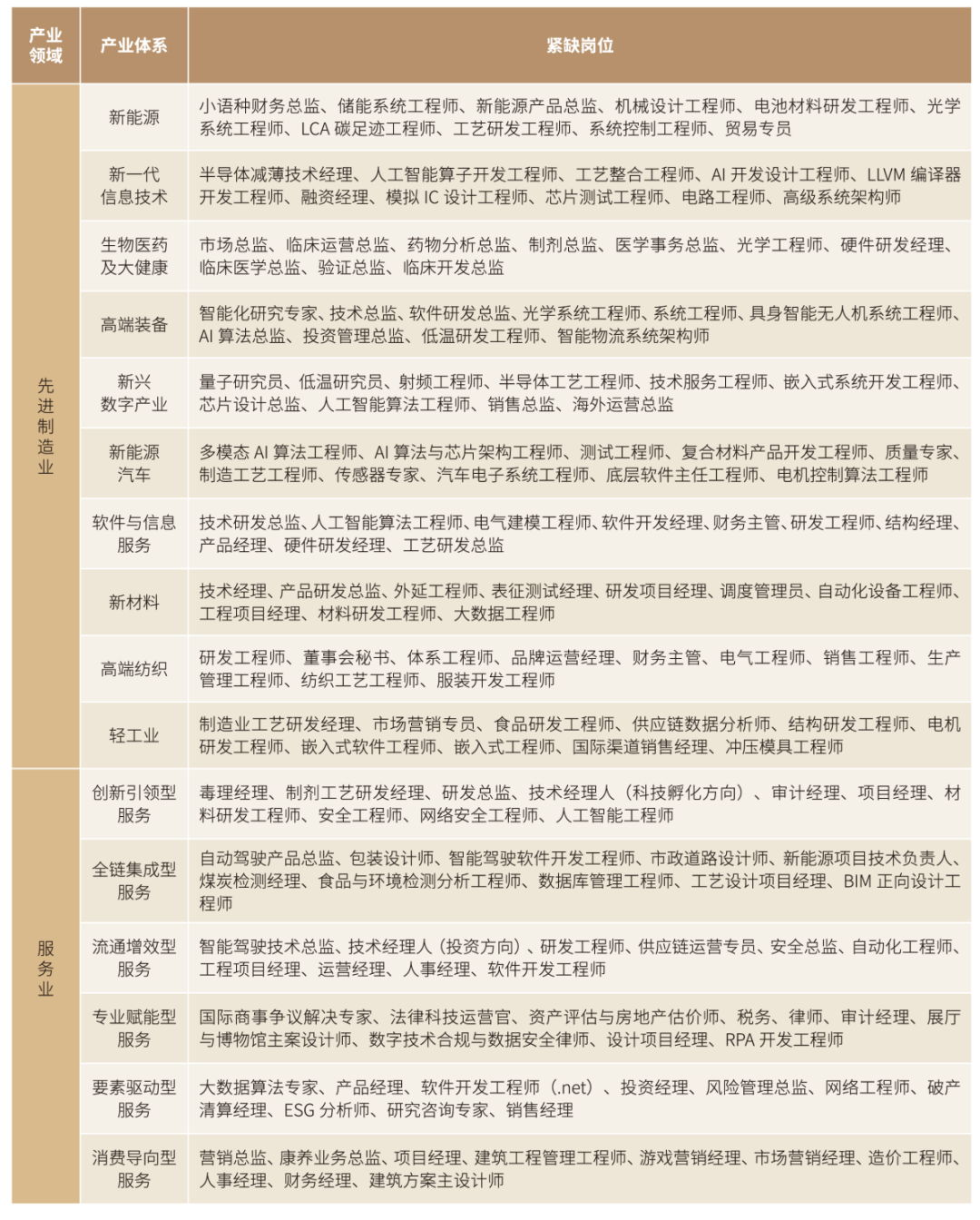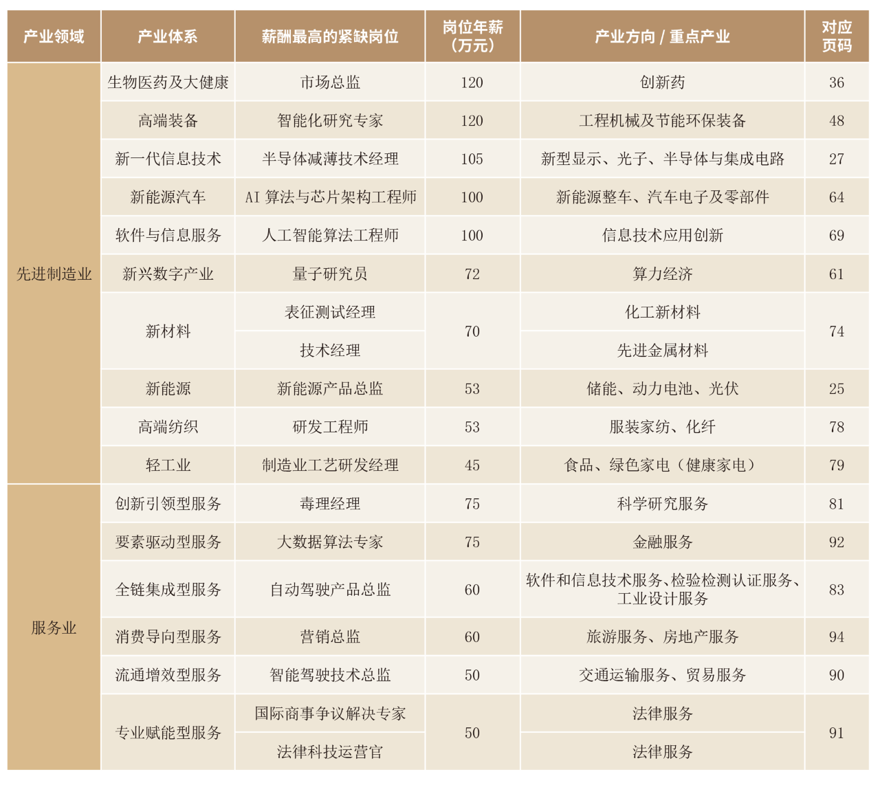 從崗位薪酬分布來看,先進制造業中智能化研究專家、生物醫藥及大健康市場總監、AI算法與芯片架構工程師等崗位年薪高達100萬元以上;服務業中大數據算法專家、自動駕駛產品總監等崗位年薪達60萬元以上。