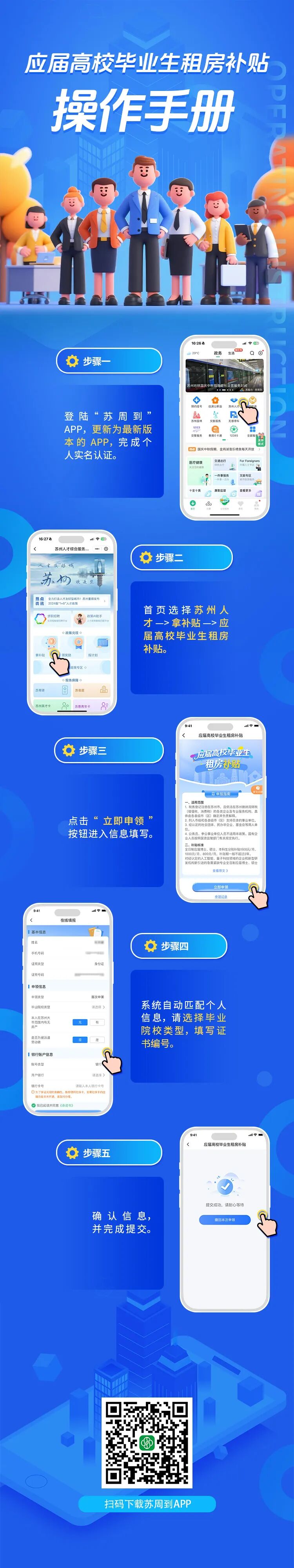 申請人需下載最新版本“蘇周到”APP,實名認證后,依次點擊“蘇州人才”→“拿補貼”→“應屆高校畢業生租房補貼”進行申領。