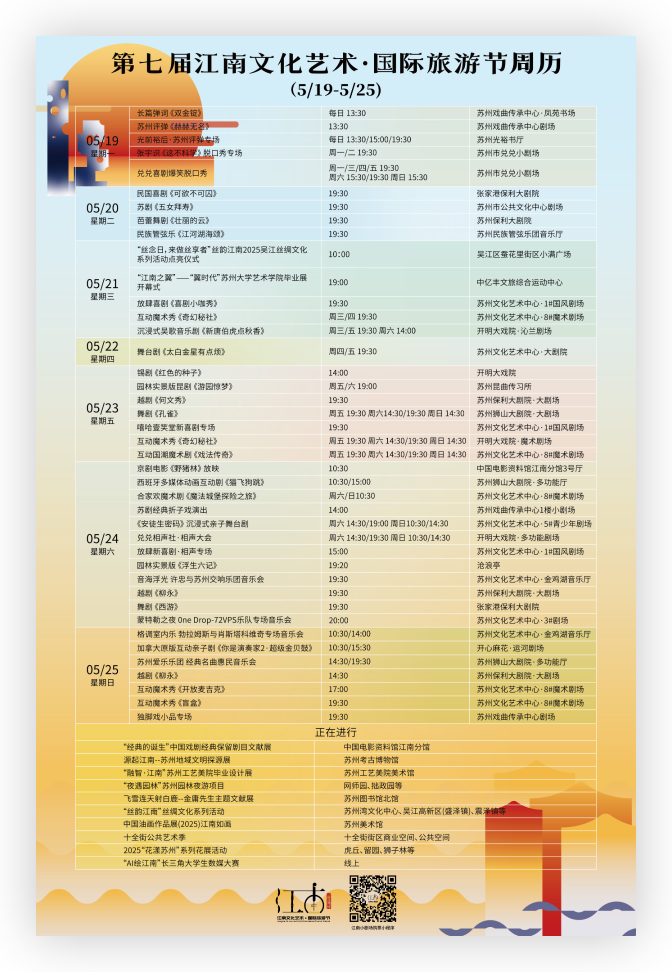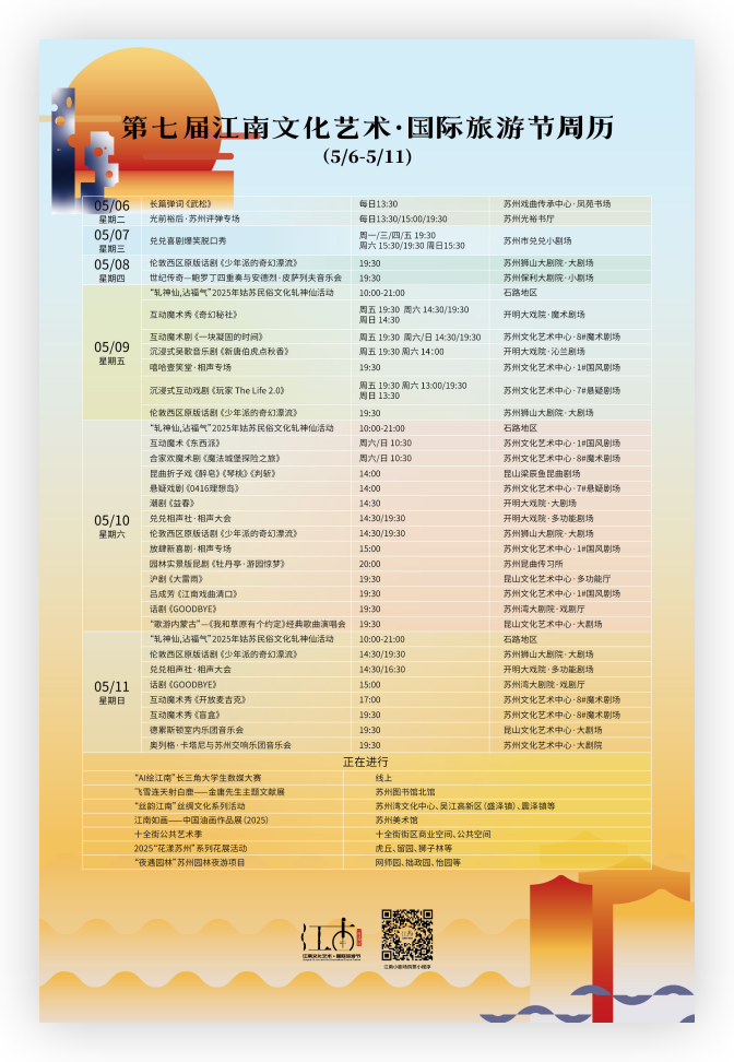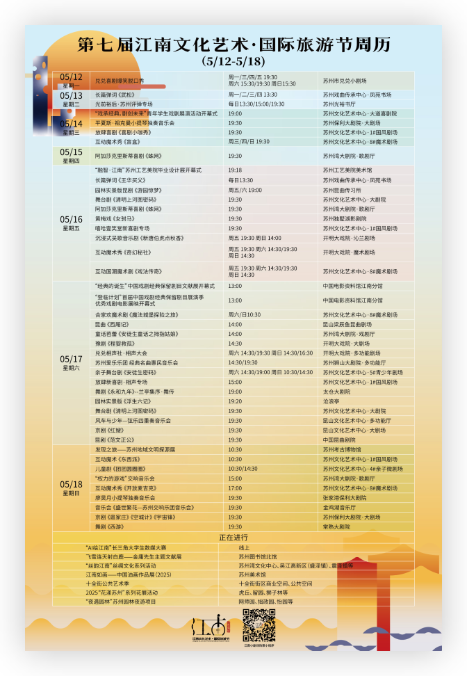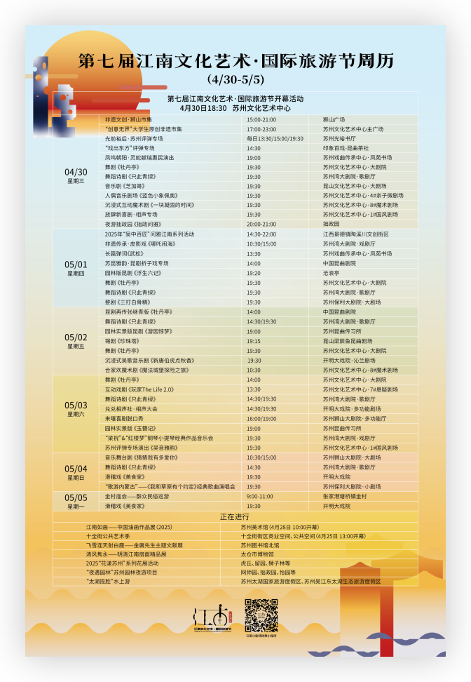 蘇州將舉辦“夏江南?尚蘇州”——文旅消費季暨第七屆江南文化藝術·國際旅游節(jié)活動。文旅消費季將于4月中下旬至6月底舉辦,貫穿“五一假期”“端午節(jié)”“畢業(yè)季”等重要節(jié)點。第七屆江南文化藝術·國際旅游節(jié)將從4月底持續(xù)至5月底。兩者時段交叉、內(nèi)容互補、雙線并行,共計將推出千余項活動和旅游產(chǎn)品。