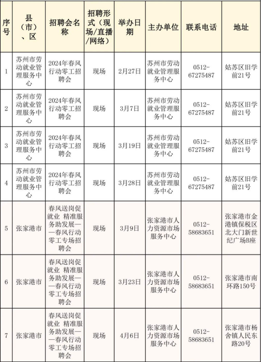 蘇州市2024年春風(fēng)行動零工市場招聘會日歷