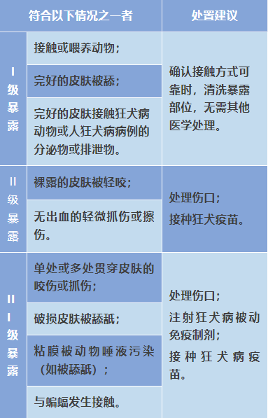 按照暴露性質(zhì)和嚴(yán)重程度將狂犬病暴露分為三級(jí),不同級(jí)別處置建議如下: