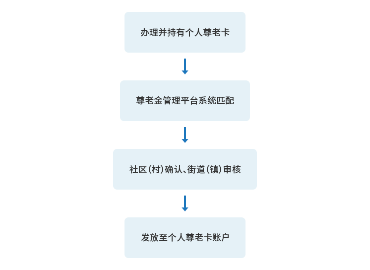 老年人申辦尊老卡后,經尊老金管理平臺系統匹配,由社區(村)確認、街道(鎮)審核,每月發放至個人尊老卡賬戶。