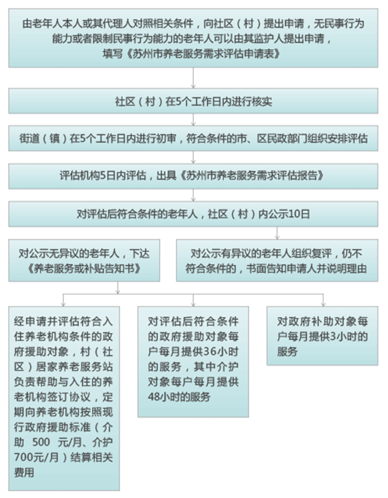 1.申請。由老年人本人或其代理人對照相關條件,向社區(村)提出申請,無民事行為能力或者限制民事行為能力的老年人可以由其監護人提出申請,填寫《蘇州市養老服務需求評估申請表(下載)》樣表