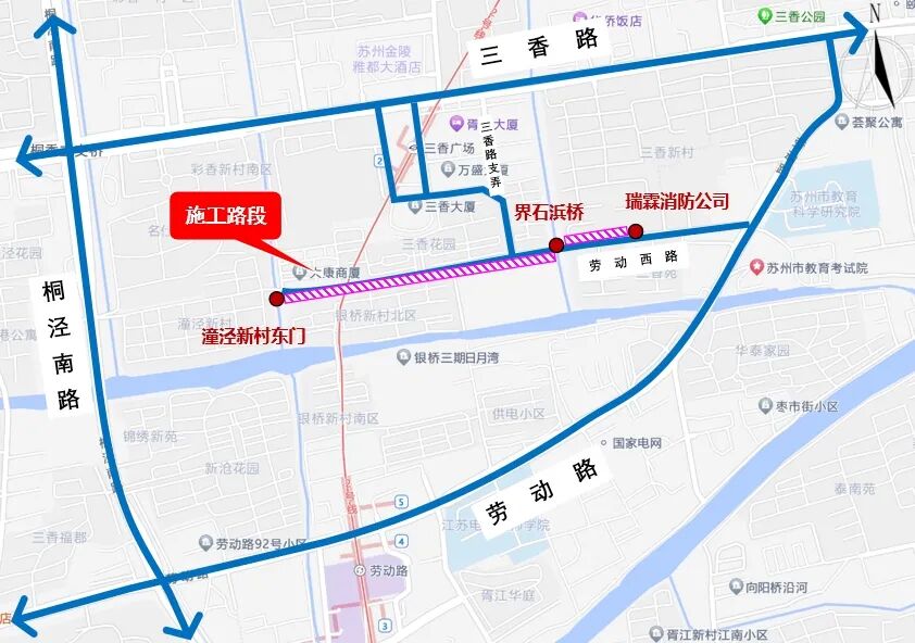 勞動西路(界石浜橋-蘇州瑞霖消防工程有限公司)段新建管線施工時間為2025年11月6日至2025年12月30日,占用北側半幅分段施工,完工一段恢復一段,機動車雙向通行,施工段交替通行,非機動車和行人正常通行。