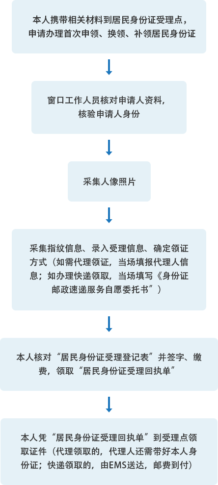 | 申報材料: | 1、居住地公安機關簽發的有效居住證,未辦理居住證的,提供其它證明合法穩定就業、就學、居住的相關證明材料。 2、身份證件,包括居民身份證(僅限居民身份證換領)、戶口簿、機動車駕駛證、護照等公安機關簽發的有效身份證件。 3、未滿16周歲公民:由監護人陪同代為辦理,須交驗監護人居民身份證、申請人居民戶口簿(如未登記父母子女關系,還須提交申請人出生醫學證明或其他證明監護關系的材料)或居民身份證(僅限居民身份證換領),以及申請人合法穩定就學、居住的其中一種證明材料。 |