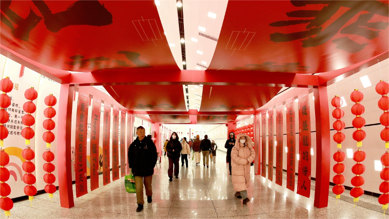 走進蘇州軌道交通勞動路站換乘通道,滿滿的年味撲面而來。通道兩側搭建了掛滿燈籠和兒童字畫的紅色桁架,許多過路的乘客停下腳步拍照留影,成為新年新晉打卡地。