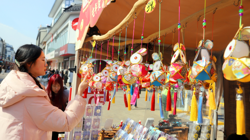 元宵節(jié)臨近,色彩亮麗、造型可愛的兔子燈熱銷。圖為昨日(2月6日),顧客在觀前街選購?fù)米訜簟?/p>