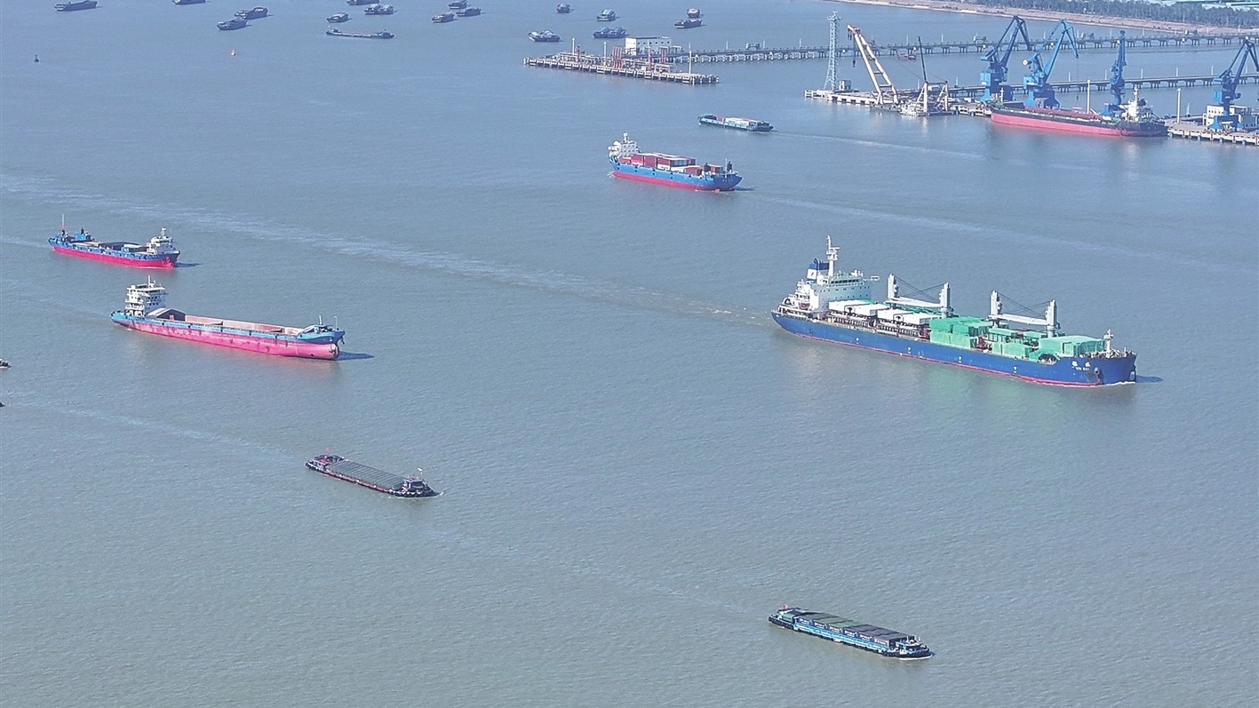 在長江航道張家港段,裝載著木材、糧油、煤炭、種子等生產(chǎn)生活物資的各類船舶在江面上往來航行。