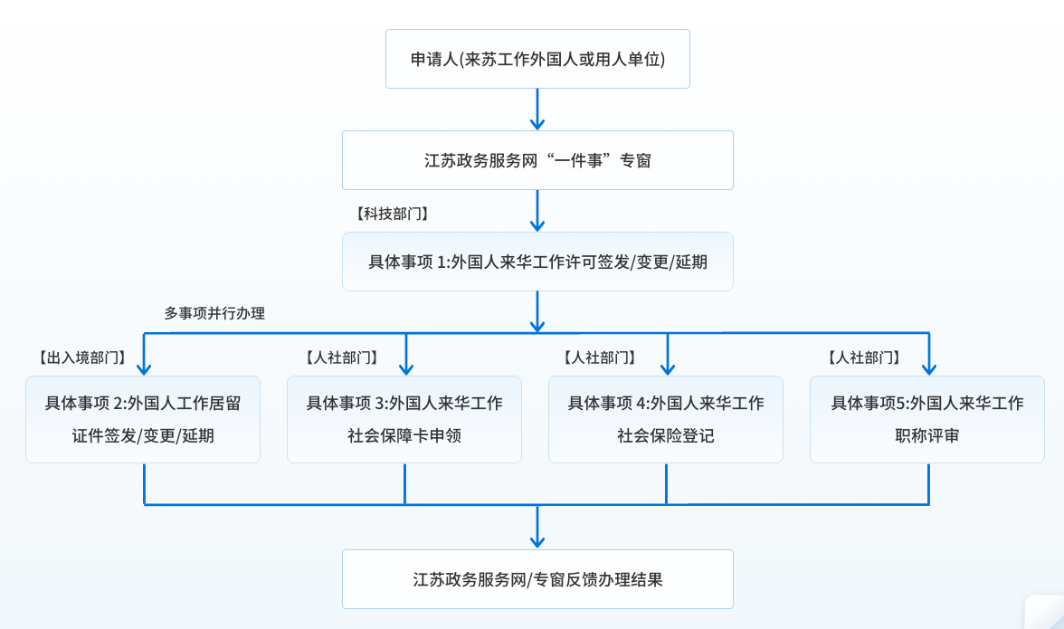 通過“高效辦成一件事”改革,來蘇工作的外國人提供工作許可簽發/變更/延期、工作居住證簽發/變更/延期、社會保障卡申領、社會保險登記、職稱評審等需多個部門辦理。關聯性強,查詢難度大的核查事項集成辦理,為來蘇工作的外國人提供外國人來華工作“一件事”高效辦成服務。